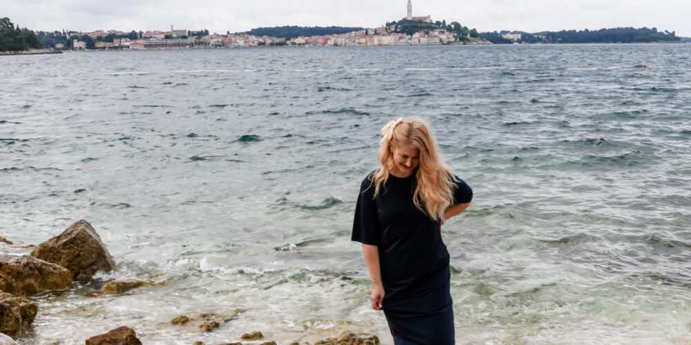Maybe you can try it oversized, cropped, or patterned. Love your beat-up sneakers? Rock them with unexpected outfits. But really, basics give you the perfect base to play with stuff on top, without feeling like you’re stepping way out of your comfort zone.